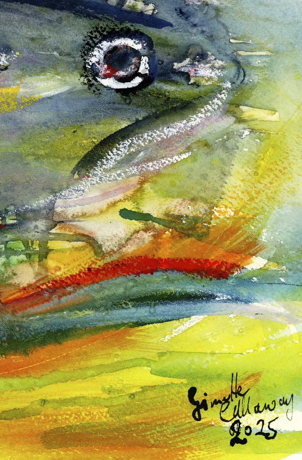 The work’s vitality emerges from the harmony—and subtle tension—between the watery translucence of the pigments and the textural richness added by soft pastel accents. This fusion of mediums gives the scene depth and movement, as if the fish might slip off the surface and swim freely beyond the frame. More than a mere study of marine life, the painting invites contemplation of transformation and fluidity, where boundaries dissolve and elements coexist in a vivid, living dance.