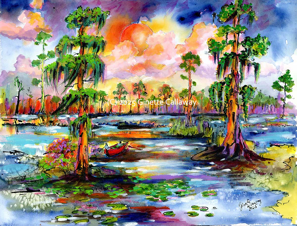 Measuring 24 by 18 inches Florida Wetland Sunset is a compelling watercolor that captures the quiet drama of a swamp landscape touched by the final light of day. The scene unfolds across a reflective body of water, where tall cypress trees—draped in delicate swaths of Spanish moss—stand sentinel like ancient guardians. Their vertical forms are punctuated by soft lily pads that float gently on the surface, creating a textured interplay between stillness and subtle motion.
