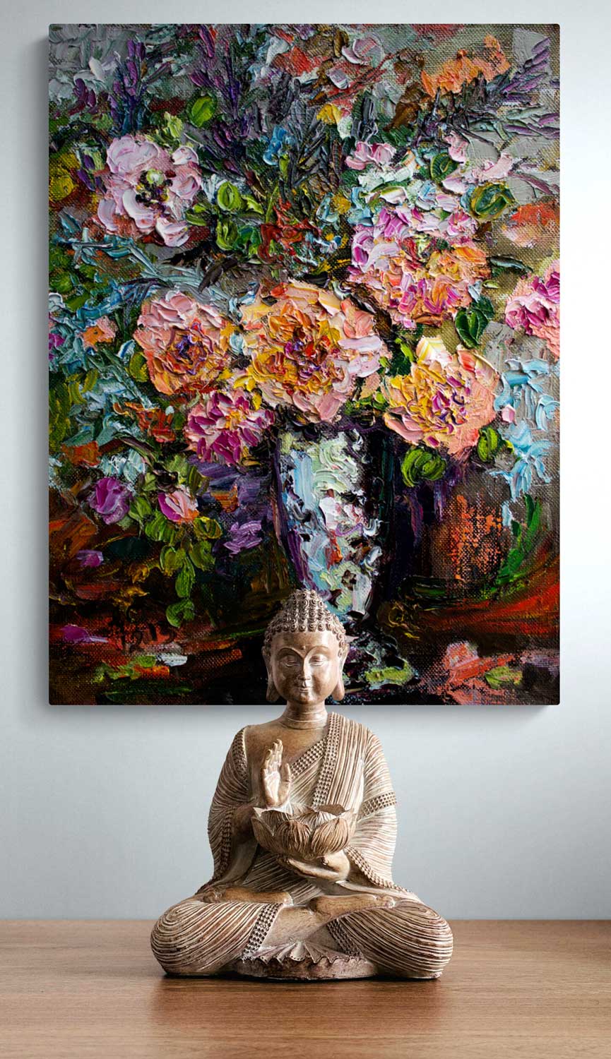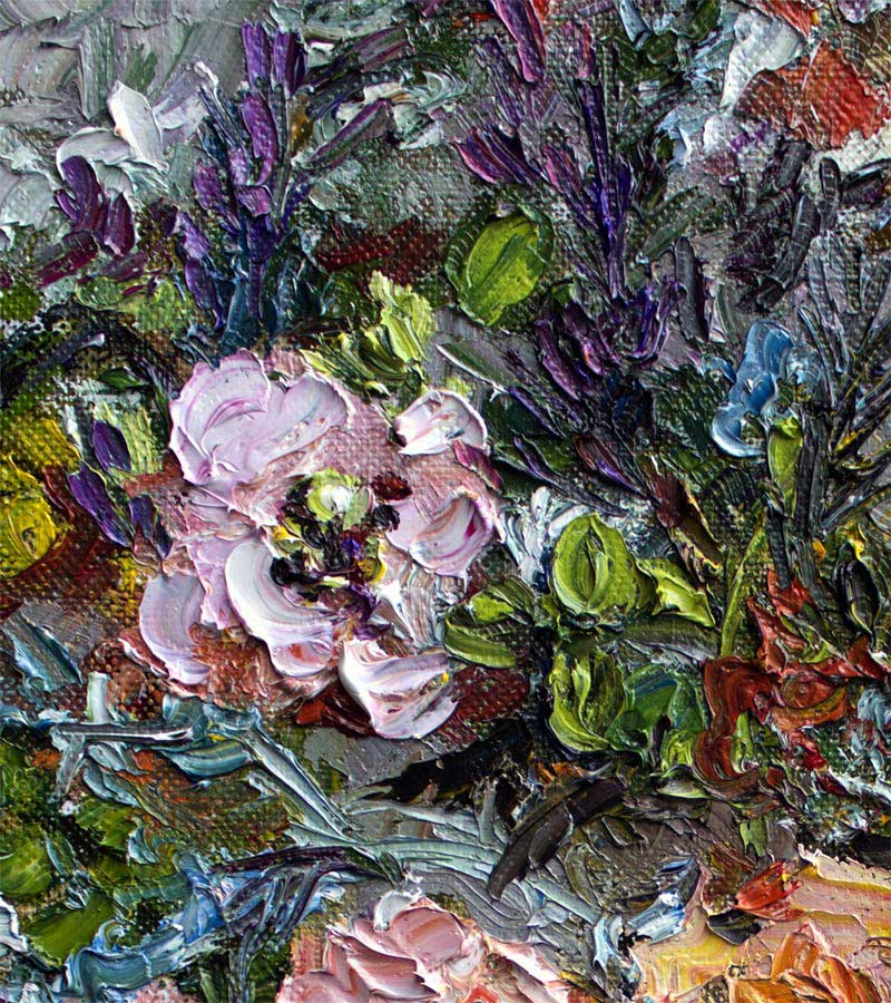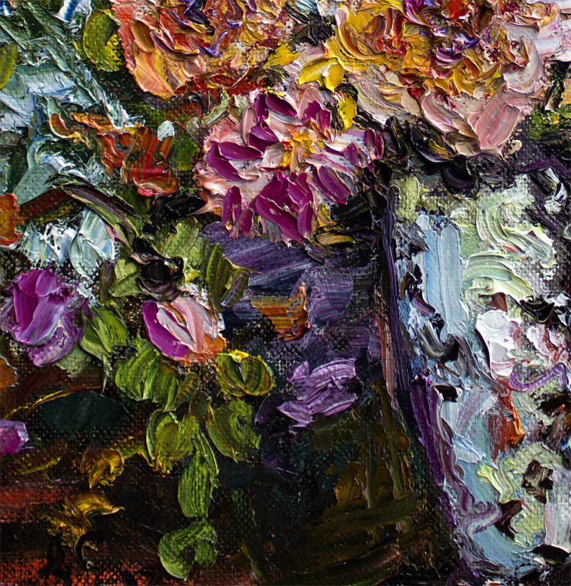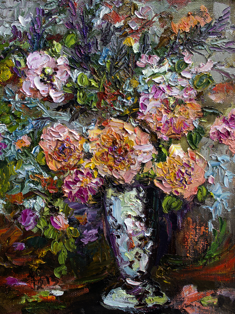 The artwork is a vibrant, textured oil painting of a bouquet of flowers arranged in a tall, reflective silver vase. The flowers are rendered with thick, expressive brushstrokes. A rich palette of colors including shades of pink, peach, yellow, purple, and green. The foliage intertwines dynamically around the blossoms, providing depth and movement to the composition. The background is filled with abstract, layered brushwork in muted tones that contrast with the vividness of the flowers, enhancing the three-dimensional effect and making the bouquet the focal point of the piece. The overall style emphasizes texture and color intensity, creating a lush and lively floral still life.