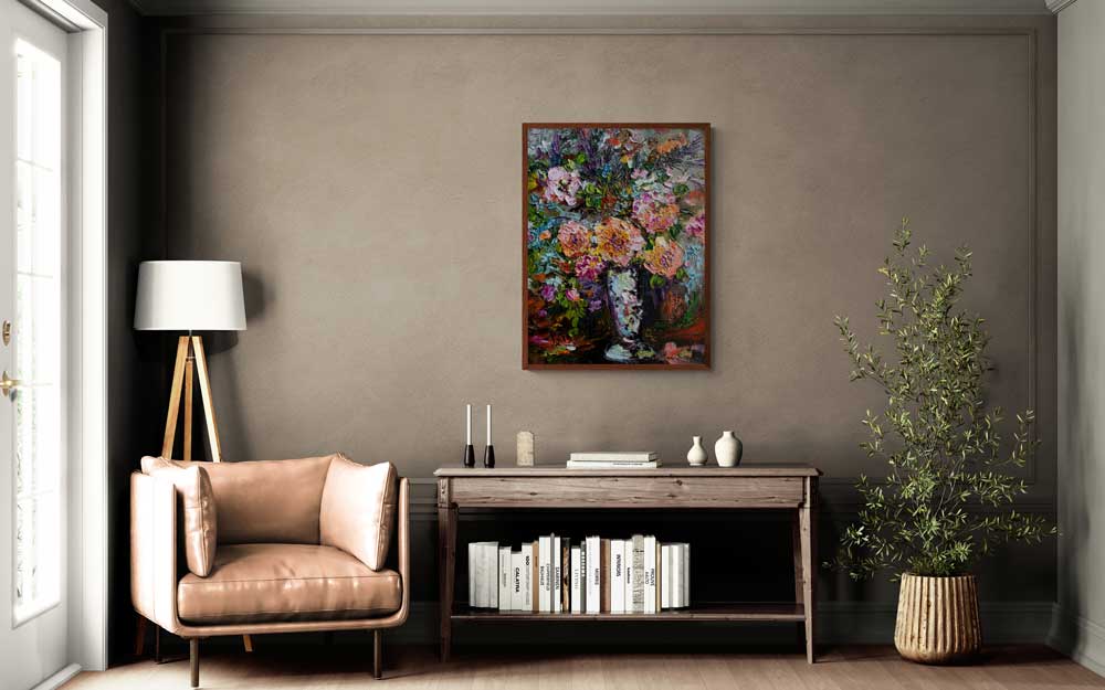 Executed in a traditional Impressionist style, the piece emphasizes texture and color as its primary languages—each stroke carrying the impulse to capture not only the roses’ physical presence but their ephemeral essence. This tension between the tangible and the transient mirrors the delicate balance between memory and moment, inviting reflection on the passage of time and the quiet dignity found in everyday beauty.